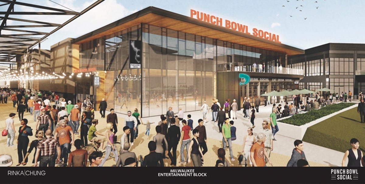 The Entertainment Block will be across from the upcoming Wisconsin Entertainment and Sports Center, which will open on Aug. 26. Punch Bowl Social will be one of several establishments on the Entertainment Block, including Good City Brewing.